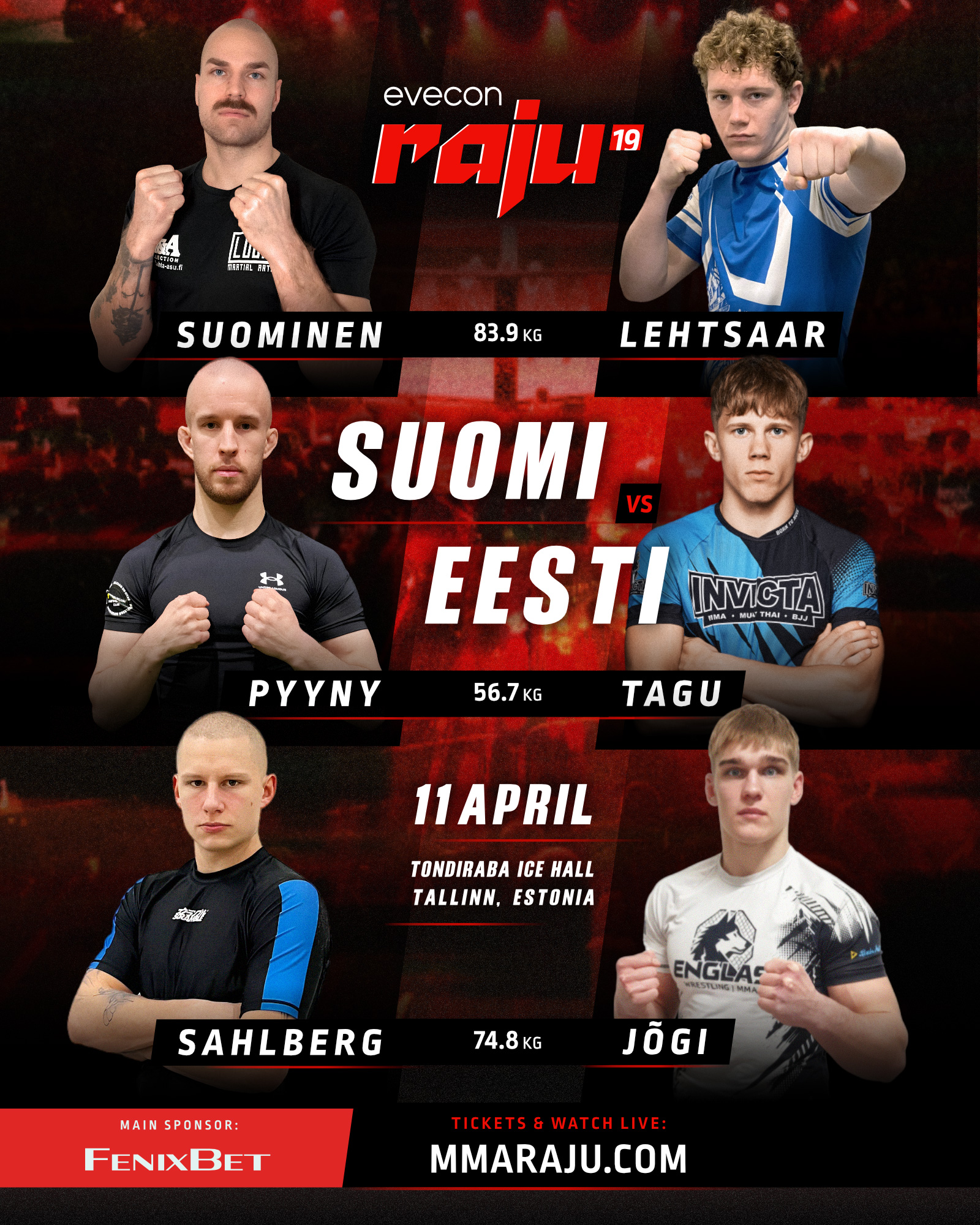 В рамках крупнейшего в странах Балтии турнира по смешанным единоборствам Evecon Raju 19 состоятся жаркие поединки среди бойцов-любителей, представляющих Эстонию и Финляндию. Бойцы из Эстонии, выступающие перед домашней публикой, встретятся с опытными бойцами в лице наших северных соседей.
