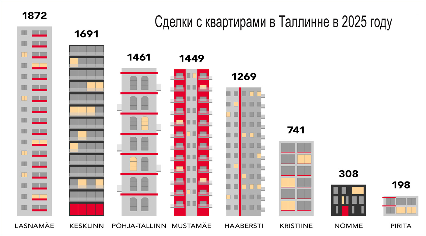 В прошлом году районом, где было заключено наибольшее количество сделок с квартирами (в общей сложности 1872 сделки), стал Ласнамяэ. По сравнению с 2024 годом, активность заключения сделок в Ласнамяэ выросла на 14%. На втором месте оказался центр города, где была заключена 1691 сделка с квартирами, но годовой рост активности сделок там остался скромным, увеличившись всего на 6%. «Эти два района исторически являются лидерами таллиннского рынка недвижимости, но у них совершенно разные профили. В Ласнамяэ объём сделок стабильно высок благодаря относительно доступным по цене квартирам вторичного рынка, в то время как в центре города высокая активность сделок в первую очередь обусловлена постоянным спросом и высокой ликвидностью», — сказала Вяэри.