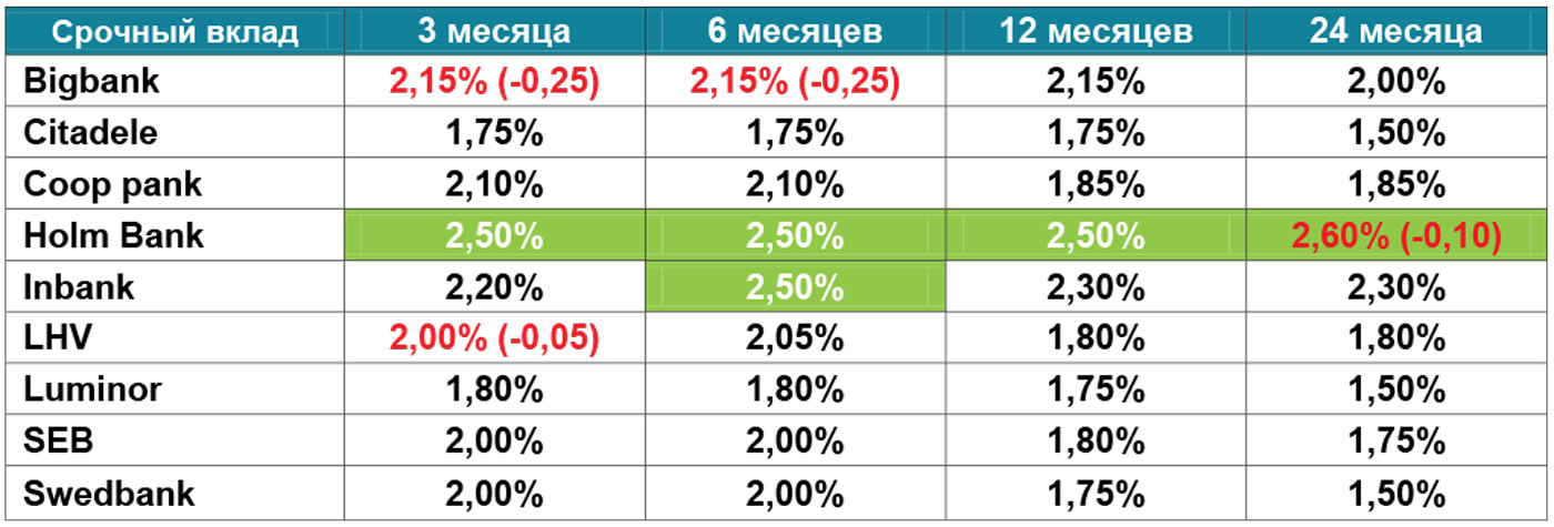 По трёхмесячным банковским вкладам лучшая процентная ставка на рынке в настоящее время составляет 2,5% у Holm Pank, за ним следуют Inbank с 2,2% и Bigbank с 2,15%. По срочным вкладам на шесть месяцев лучшую процентную ставку предлагают Holm Pank и Inbank – 2,5%, а также Bigbank – 2,15%. По вкладам сроком один год самая высокая процентная ставка в настоящее время составляет 2,5% у Holm Pank, далее следуют Inbank 2,3% и Bigbank 2,15%.