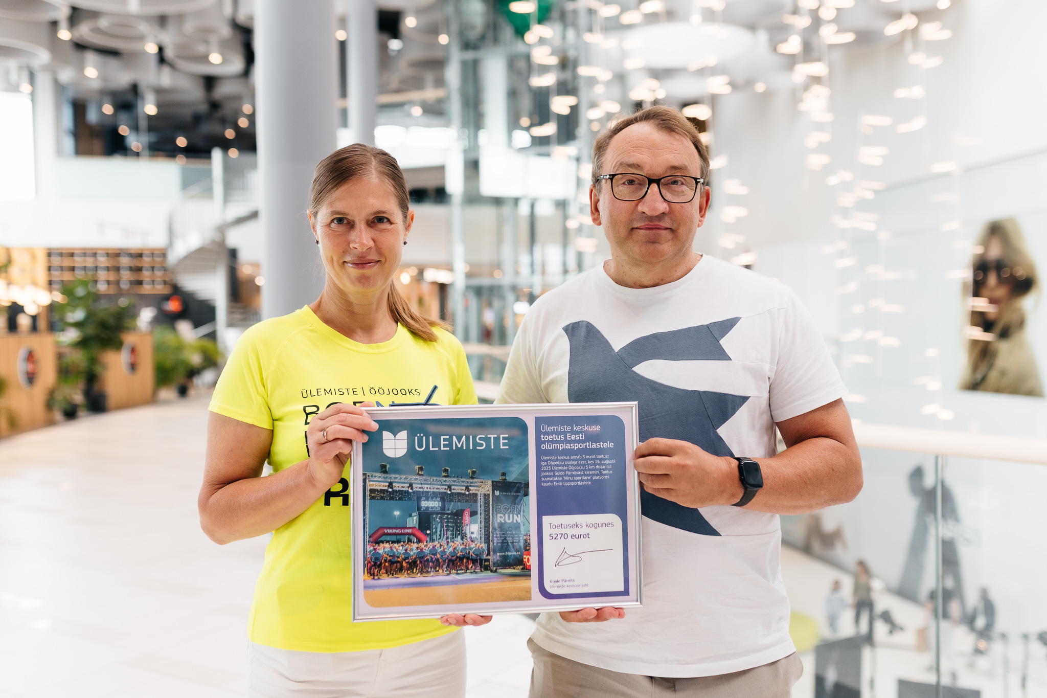 Руководитель центра Ülemiste Гуйдо Пярнитс передал президенту Олимпийского комитета Эстонии (EOK) Керсти Кальюлайд пожертвование в размере 5270 евро, собранное на прошедшем в минувшую пятницу мероприятии Ülemiste Ööjooks. Это стало крупнейшим на сегодняшний день вкладом со стороны частного предприятия, поступившим на краудфандинговую платформу «Minu Sportlane».