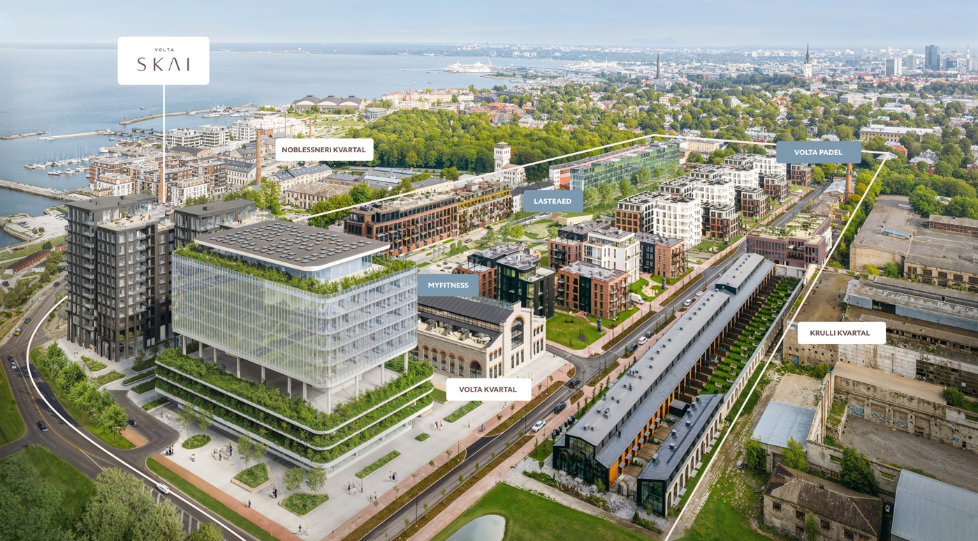Сегодня в квартале Volta девелопер Endover приступил к первому этапу строительства дуэта высотных зданий Volta SKAI. Первая дополняющая силуэт Пыхья-Таллинна 12-этажная башня Volta SKAI будет завершена к середине 2027 года. Это одно из самых ожидаемых зданий района: еще до начала строительства объем предварительных сделок составляет около 7,6 миллиона евро при средней цене более 9700 евро за квадратный метр.