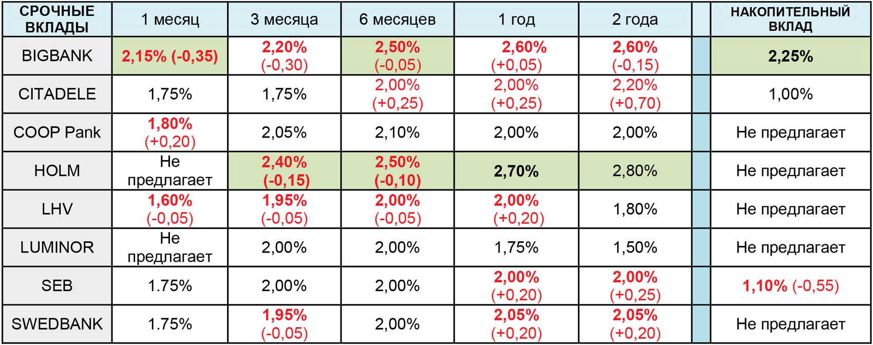 Что касается срочных вкладов для предприятий, по состоянию на начало апреля лучшие процентные ставки на рынке, независимо от срока вклада, предлагали Holm Bank и Bigbank. В данный момент, например, по вкладам на 1 месяц, лучшее предложение у Bigbank — 2,15%; по трёхмесячным вкладам для предприятий лучшую процентную ставку на рынке – 2,40% – предлагает Holm Bank, за ним следуют Bigbank с процентной ставкой 2,20% и Coop Pank со ставкой 2,05%. Что касается шестимесячных вкладов для предприятий, лучшие предложения, а именно 2,5%, делают Bigbank и Holm Bank, за ними следует Coop Pank, который предлагает 2,10%. По годовым вкладам в настоящее время самая высокая процентная ставка, предлагаемая предприятиям, 2,7%, у Holm Bank, за которым следуют Bigbank с 2,6% и Swedbank с 2,05%. По двухлетним вкладам лучшее предложение — 2,80% – у Holm Bank, за которым следуют Bigbank с 2,60% и Citadele с 2,20%. Некоторые банки предлагают бизнес-клиентам вклады также сроком на три или пять лет, однако такие варианты интересуют лишь небольшое количество вкладчиков.